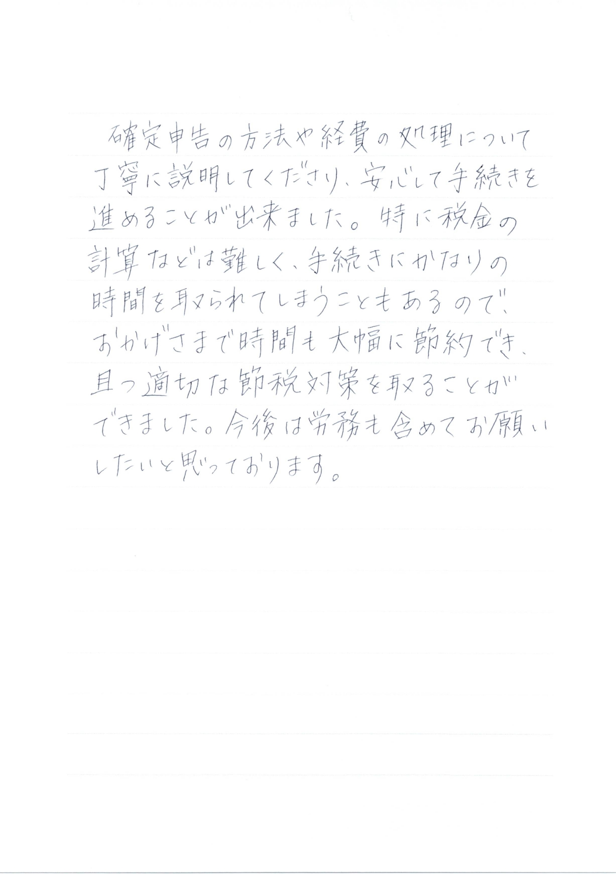 確定申告の方法や経費の処理について丁寧に説明してくださり、安心して手続きを進めることが出来ました。特に税金の計算などは難しく、手続きにかなりの時間を取られてしまうこともあるので、おかげさまで時間も大幅に節約でき、且つ適切な節税対策を取ることができました。今後は労務も含めてお願いしたいと思っております。