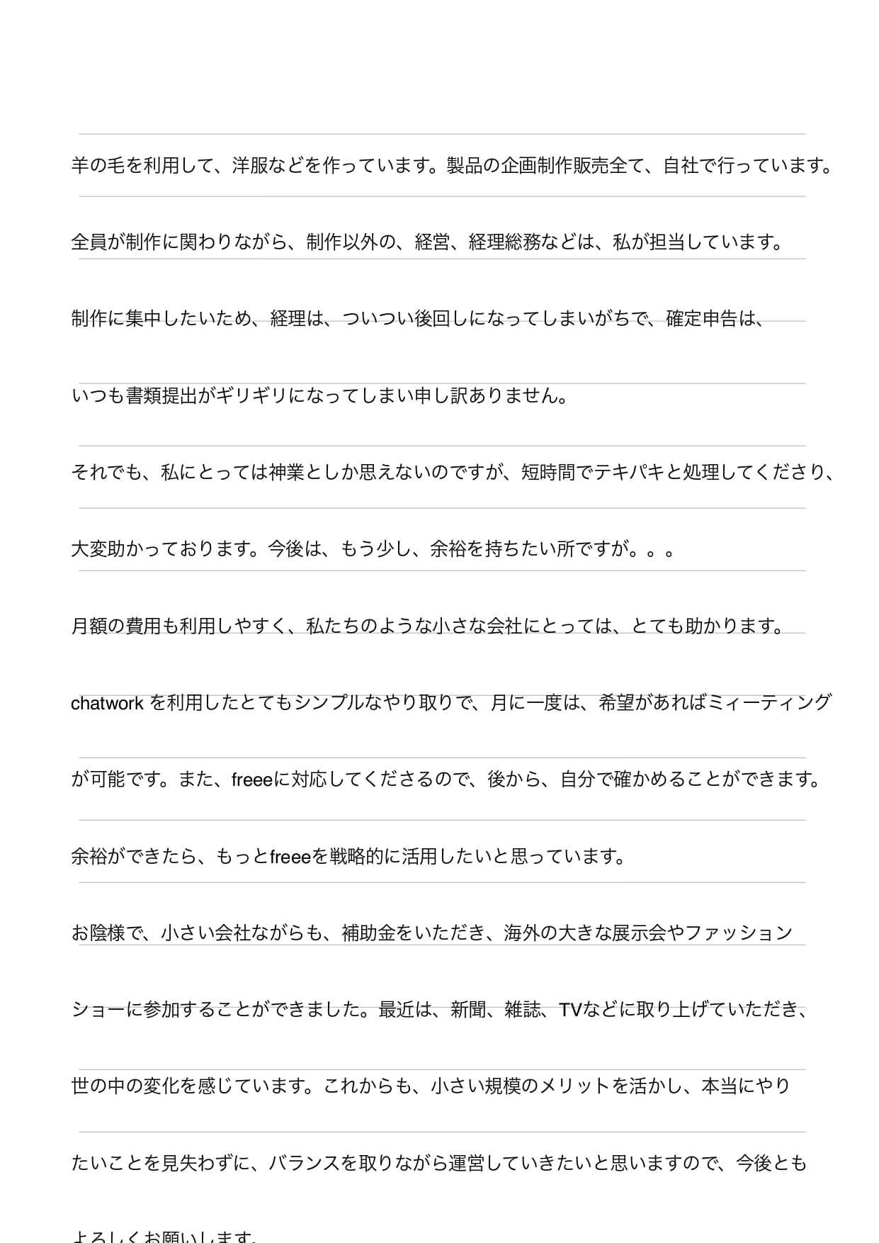 羊の毛を利用して、洋服などを作っています。製品の企画制作販売すべて、自社で行っています。全員が制作に関わりながら、制作以外の、経営、経理総務などは、私が担当しています。制作に集中したいため、経理は、ついつい後回しになってしまいがちで、確定申告は、いつも書類提出がギリギリになってしまい申し訳ありません。 それでも、私にとっては神業としか思えないのですが、短時間でテキパキと処理してくださり、大変助かっております。今後は、もう少し、余裕を持ちたい所ですが。。。 月額の費用も利用しやすく、私たちのような小さな会社にとっては、とても助かります。 chathworkを利用したとてもシンプルなやり取りで、月に一度は、希望があればミィーティングが可能です。また、freeeに対応してくださるので、後から、自分で確かめることができます。余裕ができたら、もっとfreeeを戦略的に活用したいと思っています。 お陰様で、小さい会社ながらも、補助金をいただき、海外の大きな展示会やファッションショーに参加することができました。最近は、新聞、雑誌、TVなどに取り上げていただき、世の中の変化を感じています。これからも、小さい規模のメリットを活かし、本当にやりたいことを見失わずに、バランスを取りながら運営していきたいと思いますので、今後ともよろしくお願いします。
