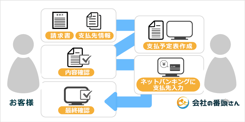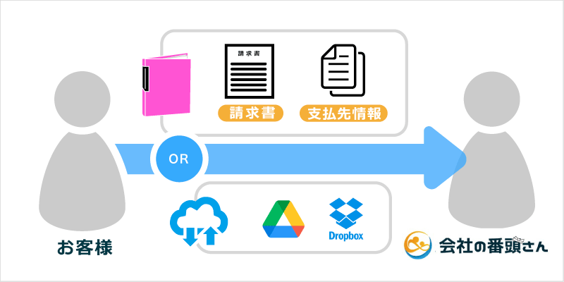 お客様から1)請求書 2)支払先情報 などを弊社にまとめて送付していただきます。 (Googleドライブ、Dropboxでの共有も可能です) |