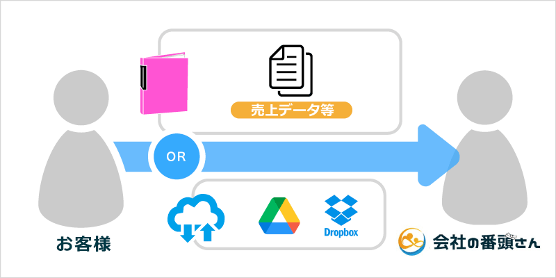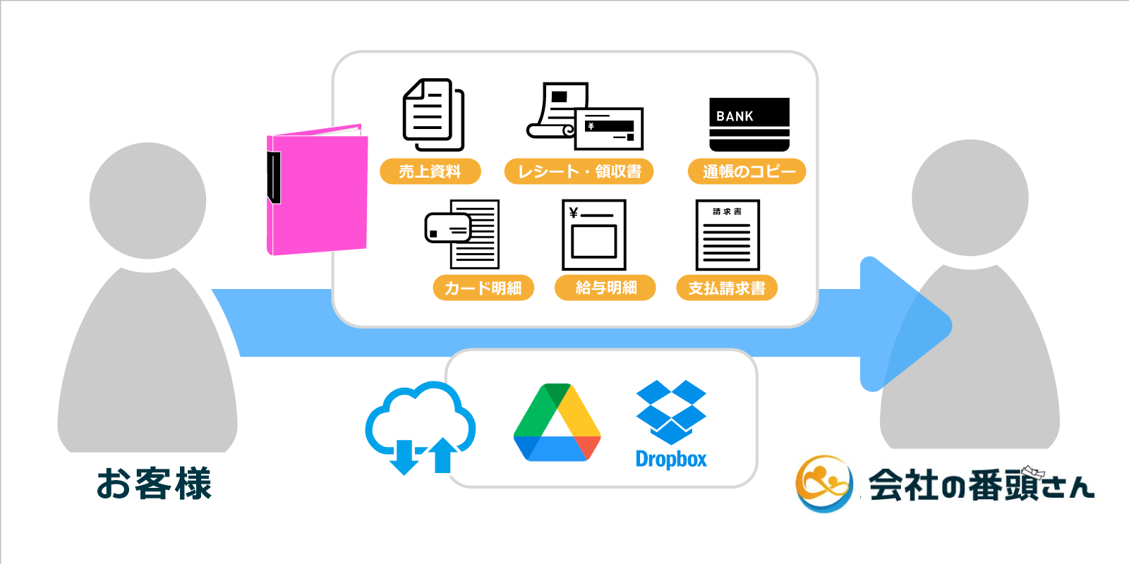 お客様から1)売上資料 2)領収書 3)通帳のコピー 4)クレジットカード明細 5)支払請求書 6)給与明細 などを弊社からお渡しするファイルにまとめて入れていただいた後、返送していただきます。Googleドライブ、Dropboxでの共有も可能です。 |