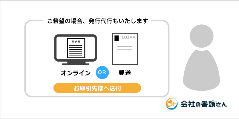 弊社で作成した請求書をご確認いただいた後、ご希望であれば弊社にてお取引先のお客様に請求書の発行代行も致します。お気軽にご相談ください。 なお、オンラインでの請求書発行を行うことで郵送コストを抑えることもできます。 |