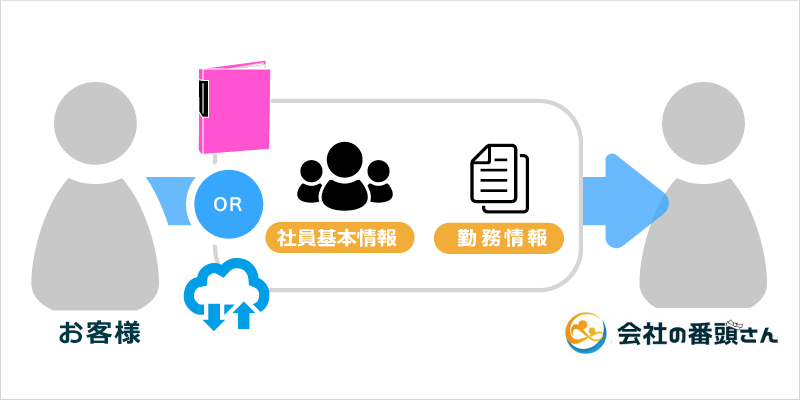 お客様から1)社員基本情報 2)勤務情報(労働日数・労働時間)を報告していただきます。 |