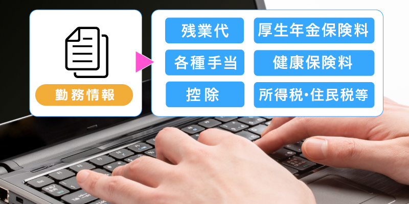弊社にて1.のデータの内容を確認し、労働日数や労働時間等の勤怠データを入力。 残業代・各種手当・控除・厚生年金保険料・健康保険料・所得税・住民税等を算出します。 ※勤怠データ連動やスピード納品、経費精算等を別途オプションサービスでご用意しています。 ※勤怠記録の様式は問いません。どのような様式でも対応いたします。 |
