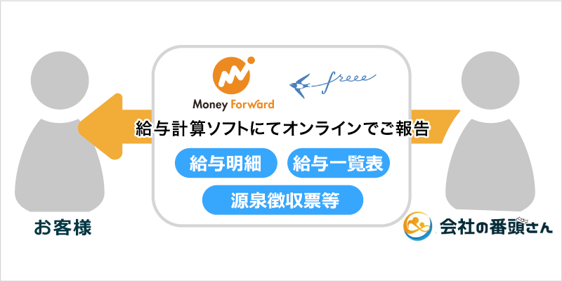 弊社にて作成した給与データを(給与明細・給与一覧表・源泉徴収票等)を給与計算ソフトにてオンラインにて報告いたします。 別途料金で、紙での給与明細発行も可能です。 併せて振込支払い代行サービスも組み合わせることができます。お気軽にご相談ください。 |